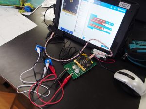 教室の設備 児童それぞれが持っている単元の実験用キット(コンデンサー、手回し発電機) 自分なりにアレンジできたのが良かった。もっといろんなセンサーを作ったり使ったりしたい。 なかなか成功しなかったけど、最後にやってみたらできた。もっと難しいプログラムもやってみたい。 教材としてmicro:bitを用いることで、理科の電気の利用の単元におけるプログラミング教育の視点を取り入れた授業は比較的容易に行えることが分かりました。子どもたちは非常に集中してプログラムを作成していました。教員側としては、トラブル時の対応に時間を取られないように、事前に起きうるトラブルを予想して準備することが大切だと思いました。